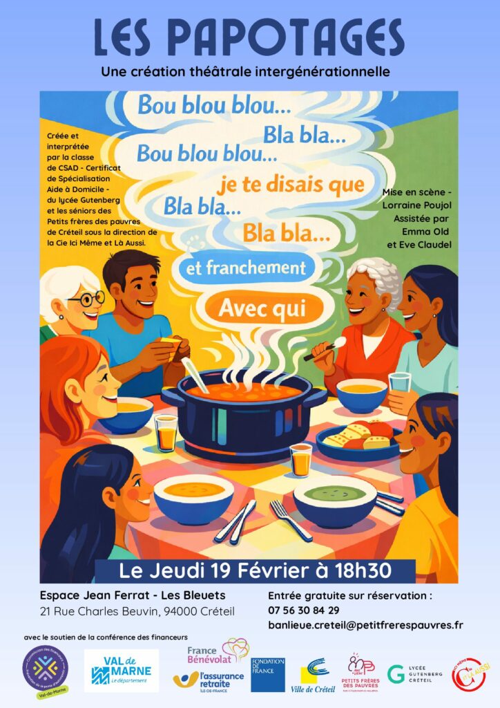 Les élèves du lycée Gutenberg vous proposent d’assister à la représentation Les Papotages un spectacle interprété par les élèves aides à domicile (CSAD) du lycée Gutenberg et les seniors de l’association « Petits frères » de Créteil, accompagnés par la compagnie IMLA.